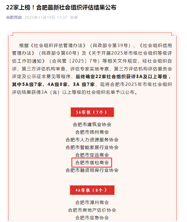 近日,合肥市社会组织等级评估结果正式公布,合肥市宿松商会凭借在组织建设、服务效能、社会公信力等多维度的卓越表现,成功获评 5A 级社会组织。这一最高等级荣誉,是上级部门对商会规范化建设与高质量发展的权威认可,也标志着商会发展迈入全新阶段。